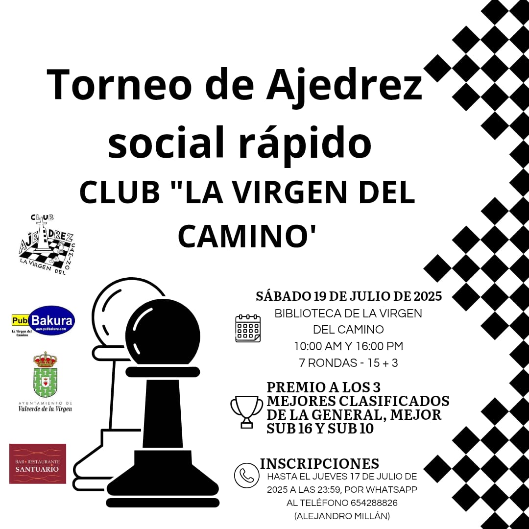Mañana sábado 19 de julio celebraremos el Torneo Social de Verano de nuestro Club de Ajedrez La Virgen del Camino. Será de mañana y tarde, con 7 rondas de 15 minutos más 3 segundos de incremento.